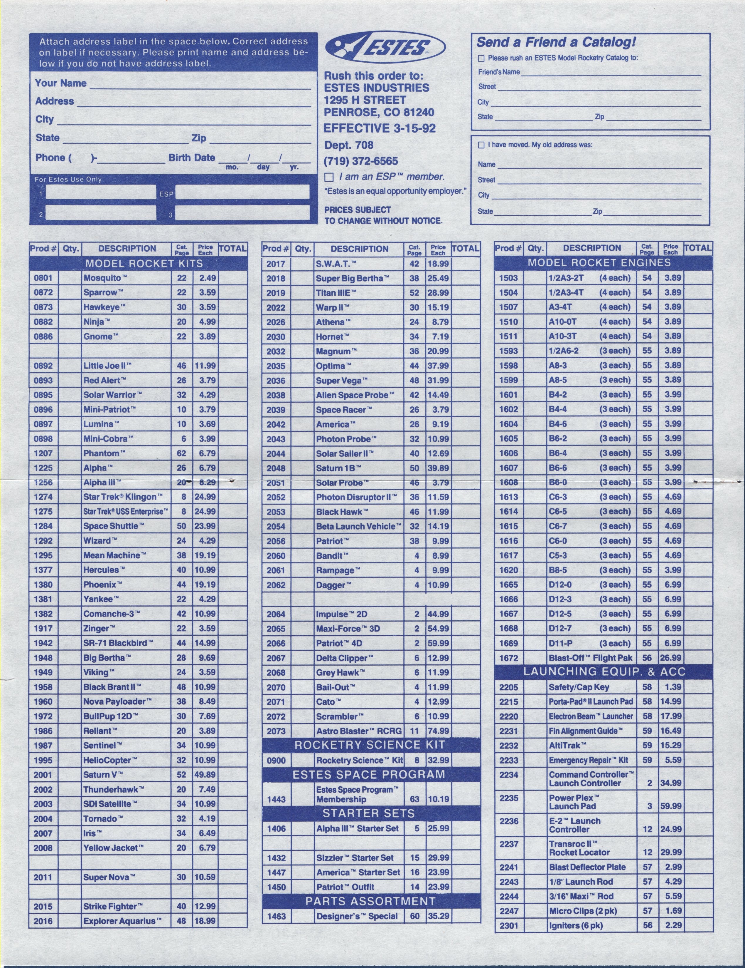 Estes 1992 Orderform