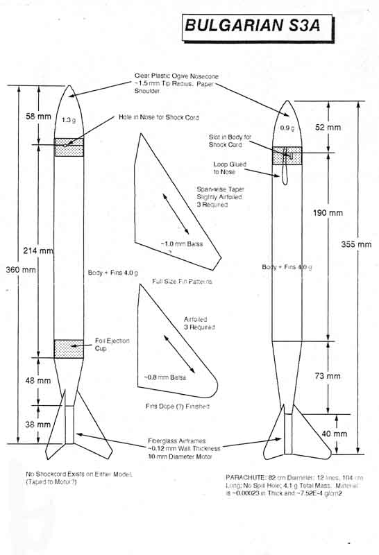 Entries for this event ordinarily have a mass of around 4 to 5 grams (model mass less parachute and motor mass)- very light considering they resemble the size and shape of an Estes Mini Bertha. Models must be a minimum of 350 mm in length with at least 50% of the length being 30mm in diameter. Because of the length and diameter restrictions, models for this event are composed typically of a straight 30mm diameter section which houses the recovery system and a boattailed section that reduces down to the motor diameter. See photo of the red rocket.